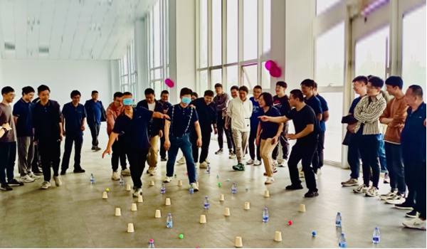這個游戲非常考驗團隊協(xié)作和指揮能力。6組每組需要選出一名代表兩組進行PK,游戲中,各組隊員需緊密配合指揮本組人員避開障礙物穿越雷區(qū)。最終,最快到達終點且避雷最多的小組將獲得冠軍。經(jīng)過激烈的角逐,最終決出了冠軍組,大家為他們歡呼,分享著勝利的喜悅。