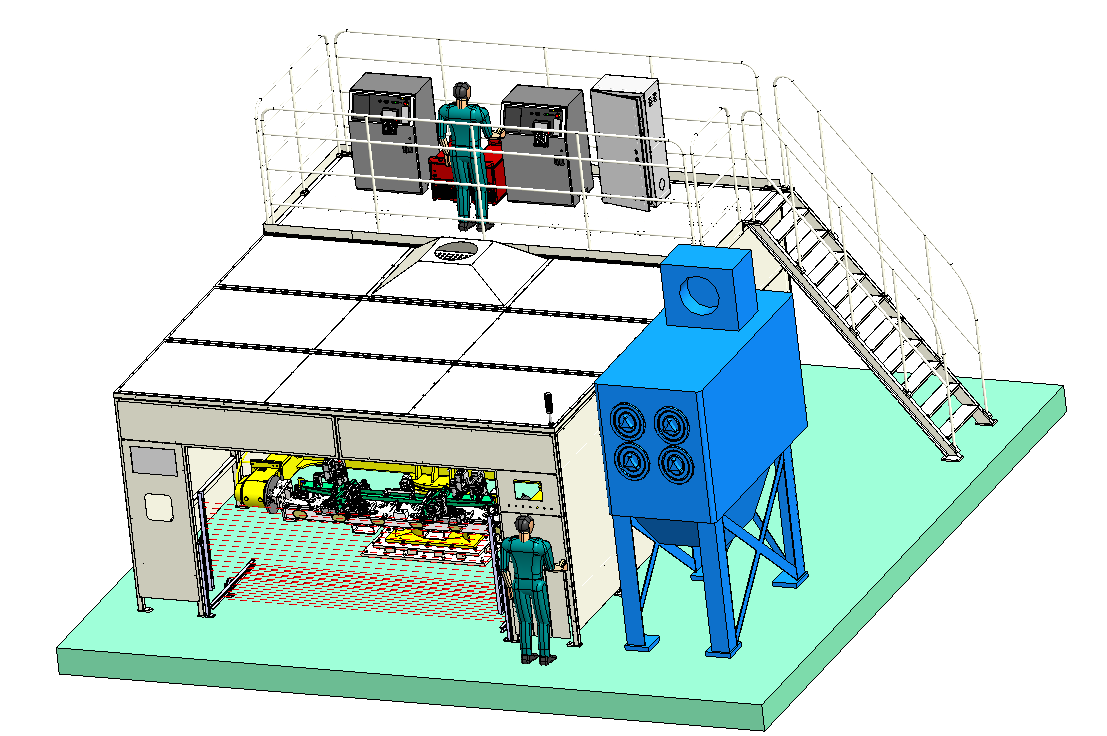 焊接系統(tǒng)采用雙機器人弧焊,水平回轉(zhuǎn)變位機,工作站內(nèi)一側(cè)裝配,另一側(cè)焊接,上部設(shè)有吸塵罩和吸塵管路,配置除塵設(shè)備。